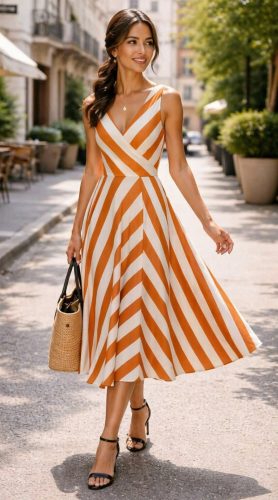 • Kadın askılı kruvaze yakalı kemersiz çizgili dalgıç midi elbise